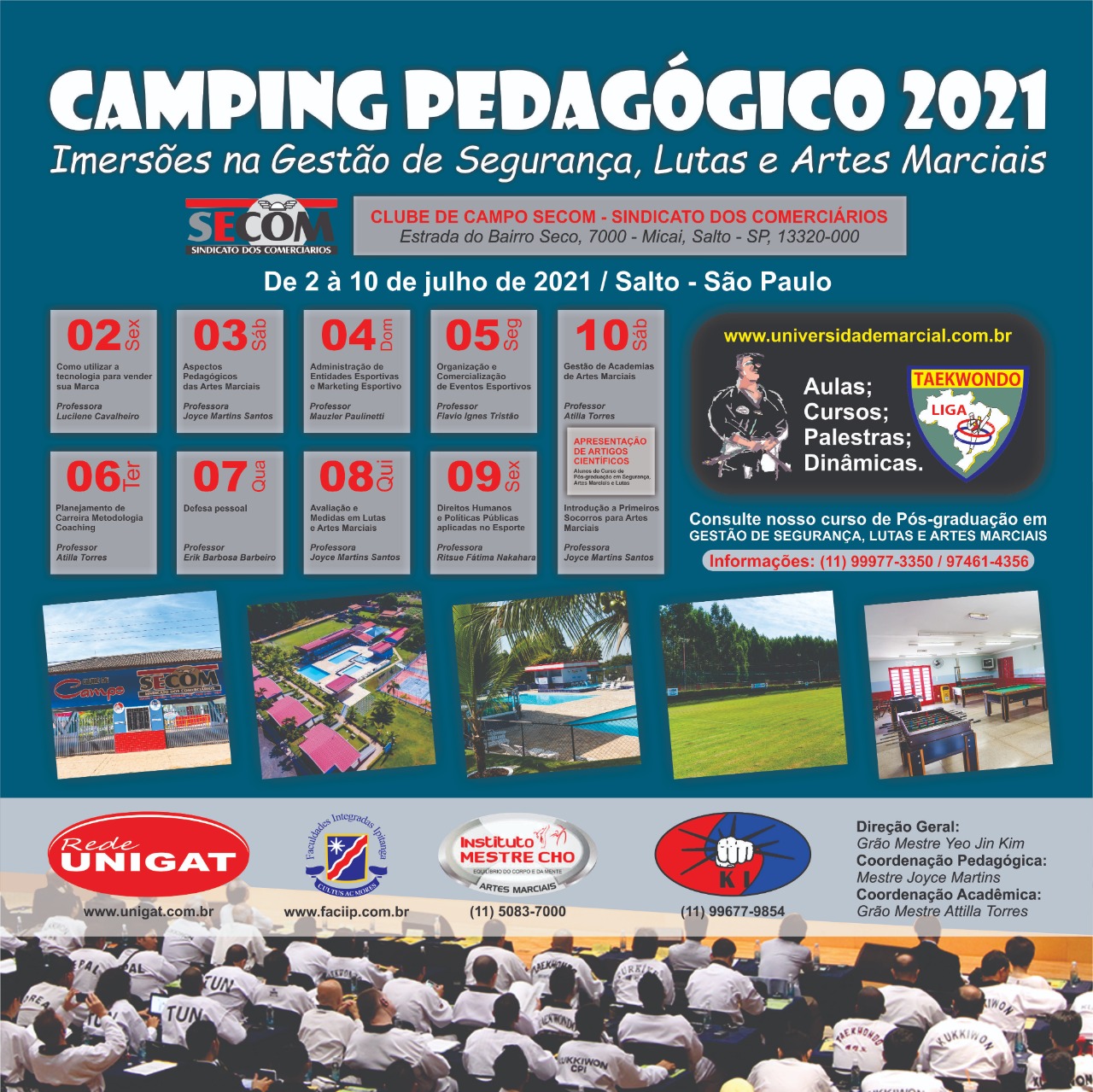 Acolhido pelo Grão Mestre Yeo Jin Kim,do Instituto Mestre Cho, Presidente Nacional de Taekwondo e Coordenador do Curso de Pós-graduação, dias de grandes imersões na Gestão de Segurança, Lutas e Artes Marciais, com Aulas práticas, Palestras, Dinâmicas e muitas interações – Presencial, com Professores altamente Capacitados, Especialistas e Mestres nos temas abordados.